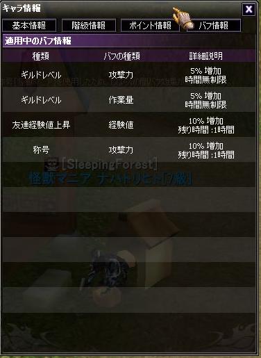 | 取得した称号を自分の名前の上につけるときに、一定時間の間、攻撃力や防御力、製造の作業量等を 増やすことができるのです。 ボス戦の前や、PTで狩をするときなど「少しでも強くなりたい!」って時 ありますよね? これらの称号は、攻撃が良く上がるもの、経験値がたくさん入るもの、バランスよく上がるもの いろいろな種類があるので、一杯称号を集めておけば、場面によって使い分ける事ができて、とっても便利です。 また、一つの称号は1回使うと、1日の間は再使用が不可能(能力アップがつかない)なので 集めた称号が一種類だけだと、すぐパワーアップの時間が切れてしまいます。 逆にいろいろ集めておけば、ずっと何らかのパワーアップができる というわけです。 |