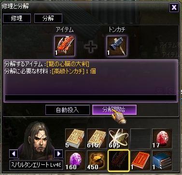 | 「分解」とは、装備品をトンカチを使って破壊し、装備の素材の一つである元素に戻す事です。 箱をあけたときに出たいらない装備などを素材にできるのですが、このときに壊した装備のジャンルの製造経験値が ちょこっとだけ入るようになっています。具体的には製造の際の1/10の経験値です。 これで破壊する装備にはレベルの制限がまったくないので、たとえばレベル90やレベル100の装備を一つ破壊すれば 製造レベル10くらいまでの経験値を稼ぐことができます。何個も砕けば20くらいまではすぐ上がるでしょう。 そして、砕いて出た元素は、そこそこの値段で取り引きされているので、そのまま売ってしまえば そこまでお金が減ることもありません(運が良ければお金が増える事も…)なので、低レベルな装備の製造を行うより ある程度のお金を使って、分解をしたほうが楽に上がるのです。 これは装備品の製造経験値を稼ぐときにしか使えませんが、逆に言えば「装備品の経験値は分解で稼ぐ」と 割り切ったほうが、製造の負担は少なくなります |